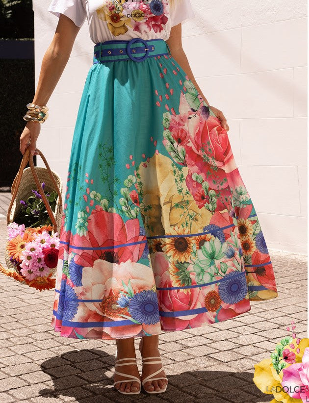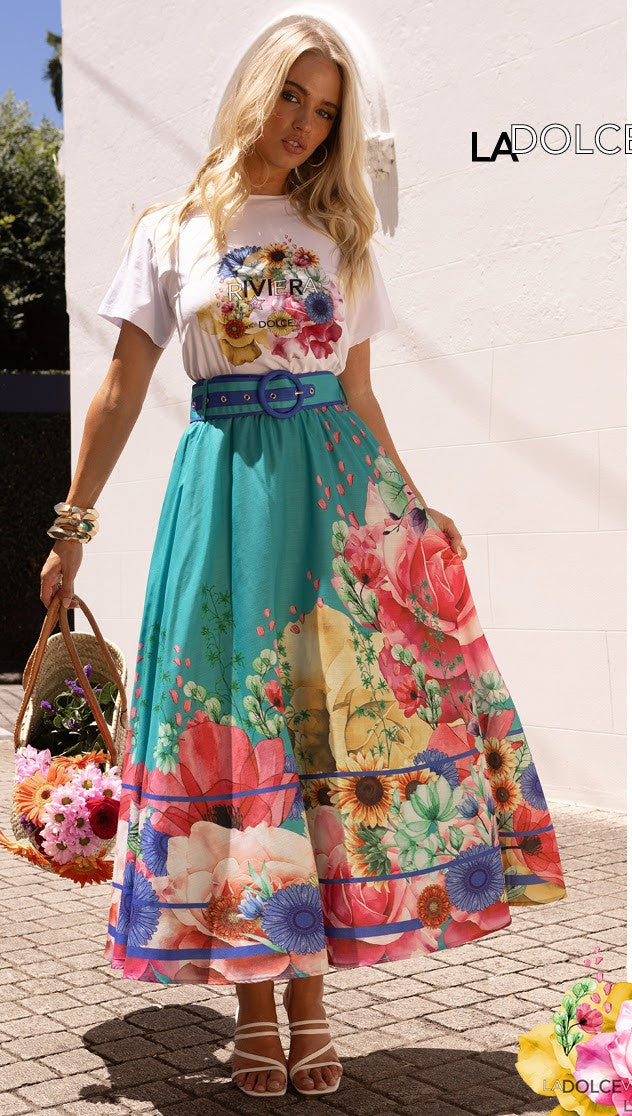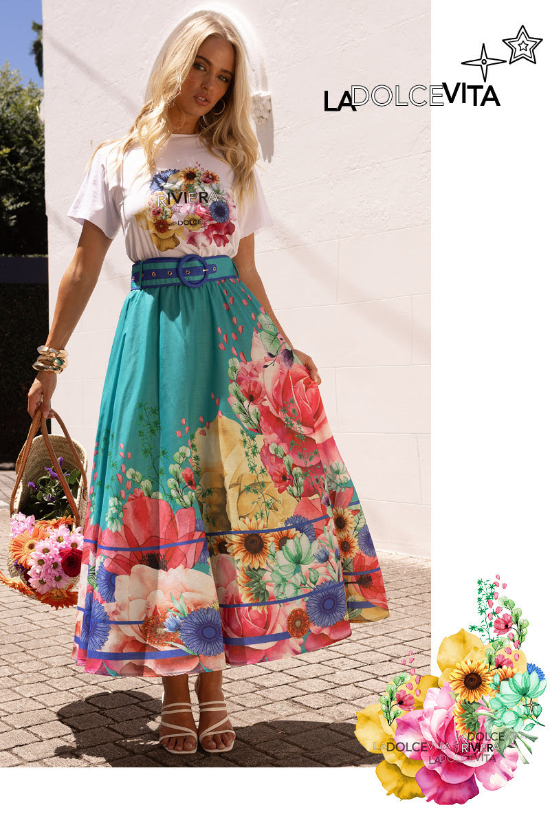 Bold, romantic, and full of vibrant charm, the La Dolce Vita Maxi Skirt captures the joyful spirit of the Mediterranean. Designed with a flattering high waist and flowing maxi silhouette, this statement skirt moves beautifully with every step. The rich emerald backdrop blooms into a stunning garden of oversized florals, sunflowers, and colourful botanical prints, creating a piece that feels both artistic and effortlessly feminine. Light and breezy with statement appeal, this skirt has side pockets and comes with a matching belt. It's the perfect event-ready skirt for that special occasion, whether you're heading to a party, wedding, race day or out for a chic lunch date. This skirt is a show-stopper! Perfectly paired with a simple blouse, tee, cami or fitted top, it’s the kind of skirt that instantly elevates any outfit. 💚