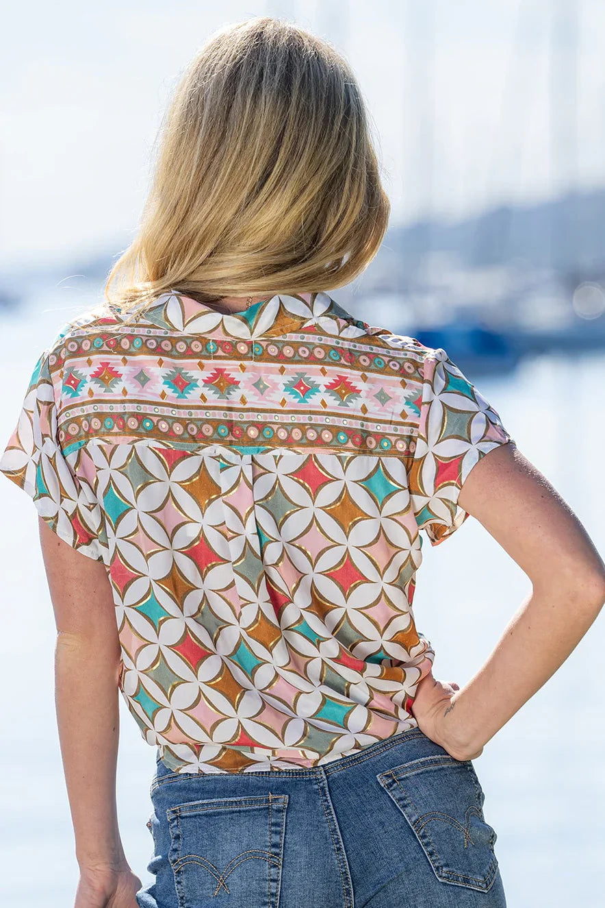 Meet the shirt that brings summer to life! The Maris Mosaic Cap Sleeve Shirt is where coastal ease meets bohemian artistry. Designed in a symphony of soft blush, turquoise, sage, clay and a pop of gold on a vanilla base. Its geometric mosaic print brings a fresh, sunlit energy to every look. Button through collared shirt with knotted tie at waist and cap sleeves. A pop of pattern, a touch of wanderlust. 💗