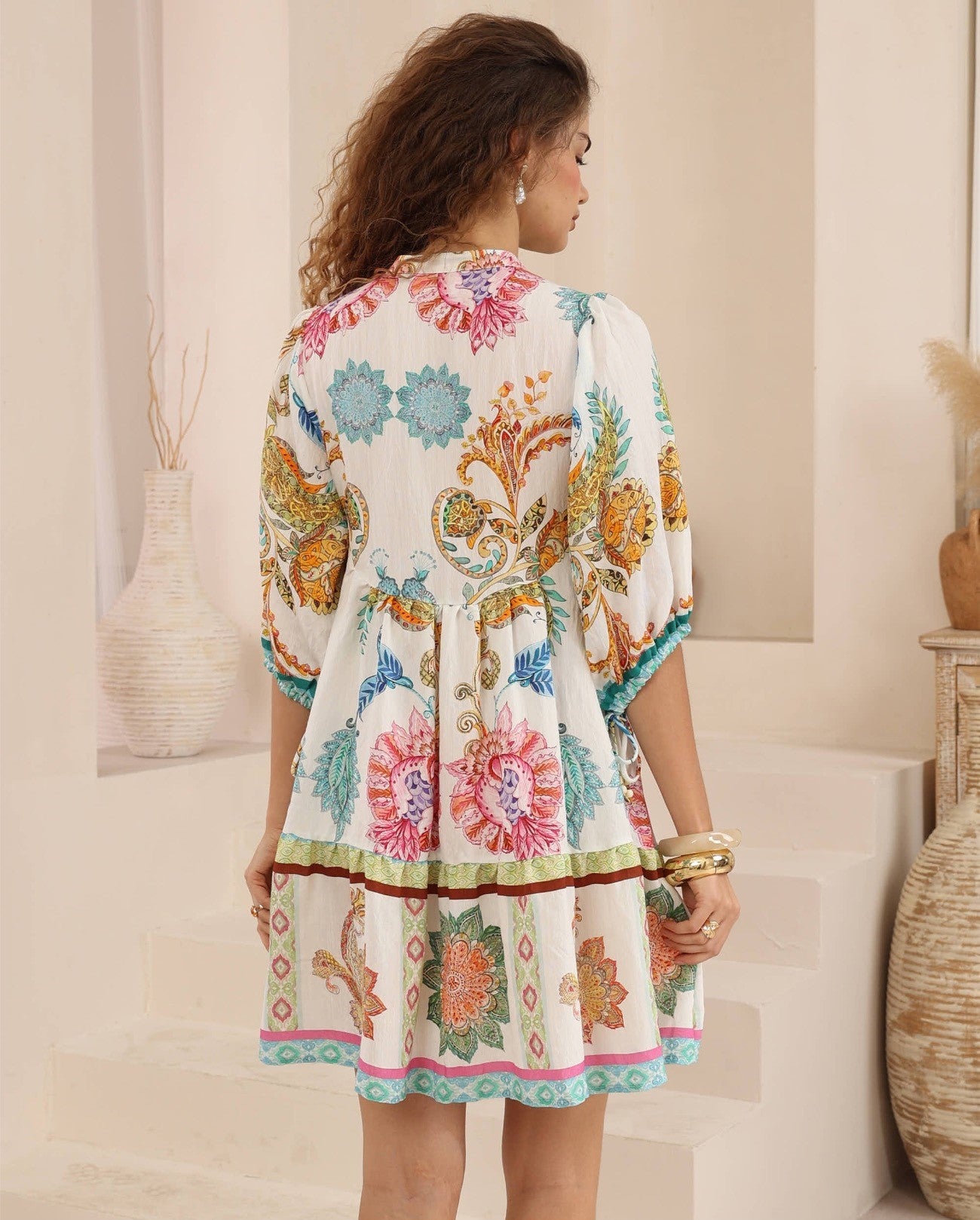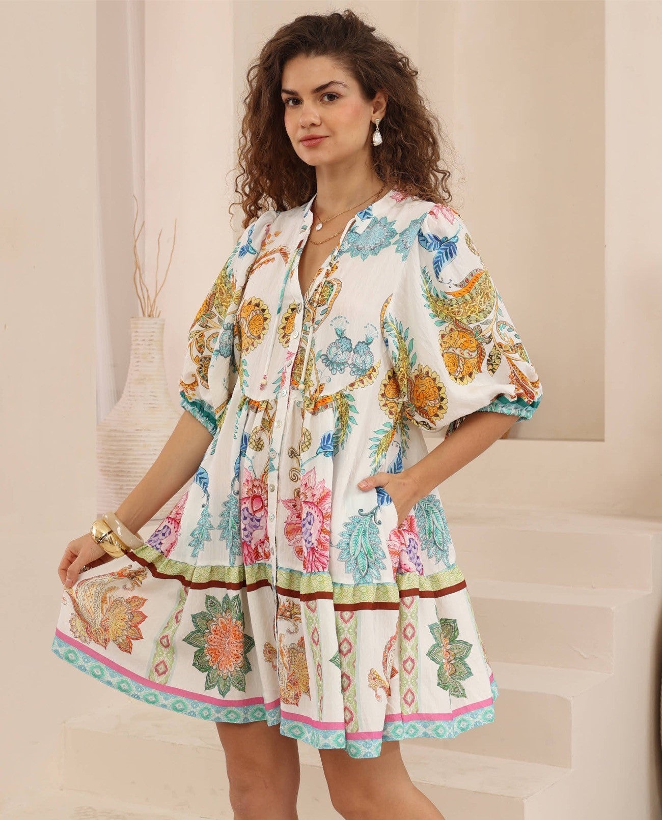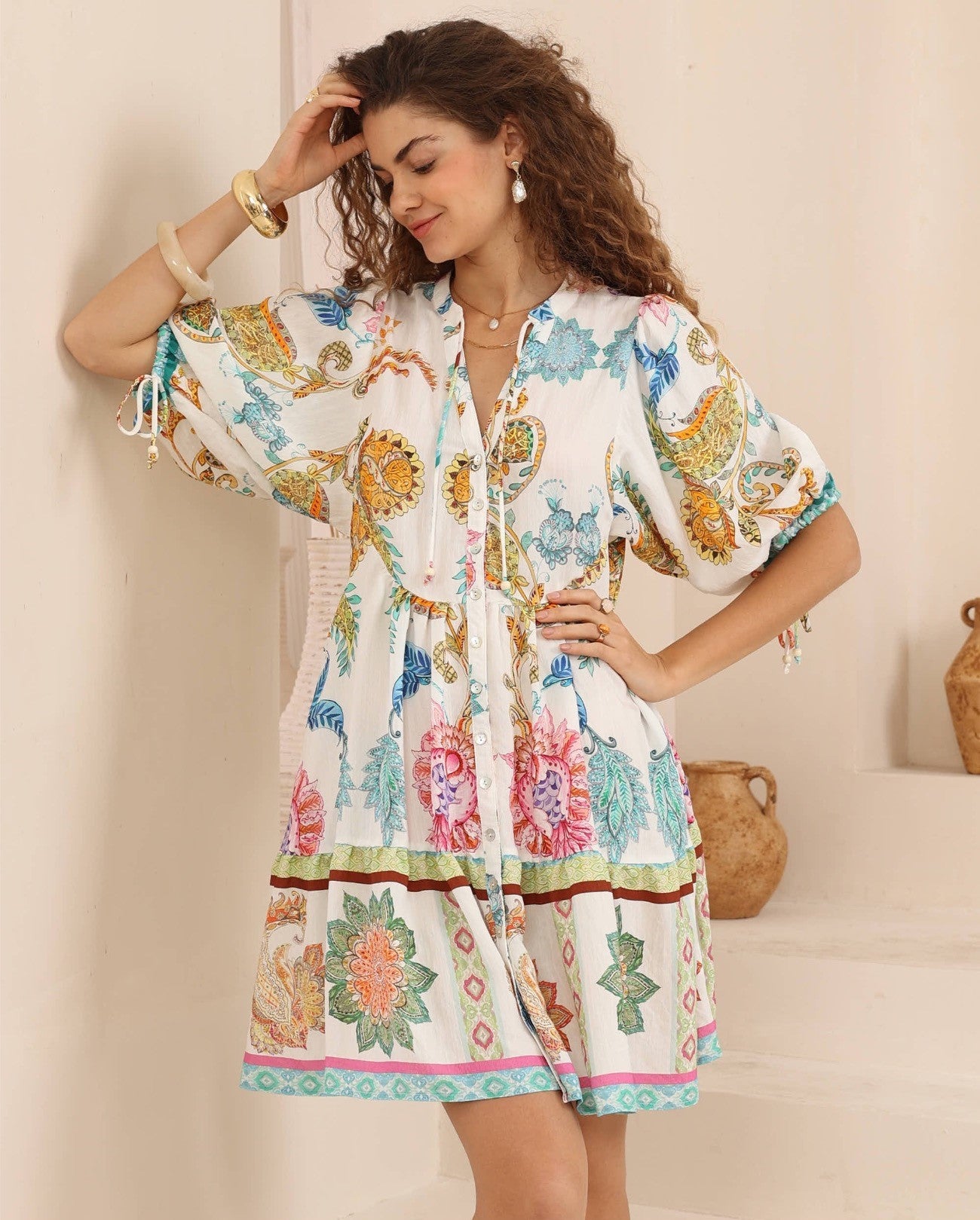 Playful, feminine and effortlessly bohemian, the Tulum Bloom Mini Dress brings a touch of tropical charm to your wardrobe. Designed with a relaxed button-through front, soft puff sleeves, and a flattering gathered skirt, this easy-to-wear mini creates a breezy silhouette perfect for relaxed days. The vibrant floral and botanical print is inspired by lush island gardens, with colourful border details that add a beautiful vintage-boho feel. Light, floaty, and full of personality, it’s the perfect dress for beachside brunches, getaways, or wandering markets. πŸ’™