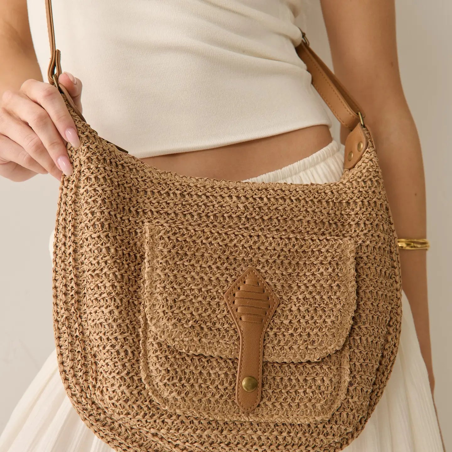 Warm, earthy and effortlessly chic, the Golden Dune Crossbody Bag is your everyday essential with a relaxed bohemian edge. Handwoven from natural straw fibres, this softly structured saddle silhouette has an adjustable vegan leather strap and accents. Fully lined with zip closure, it features a statement pocket on the front for a touch of vintage charm. Designed for comfort and versatility, it sits perfectly across the body or on the shoulder, ideal for market mornings, coastal strolls, travel days and sunset dinners. The golden sand tone pairs seamlessly with your summer wardrobe, making it a timeless addition to your collection.