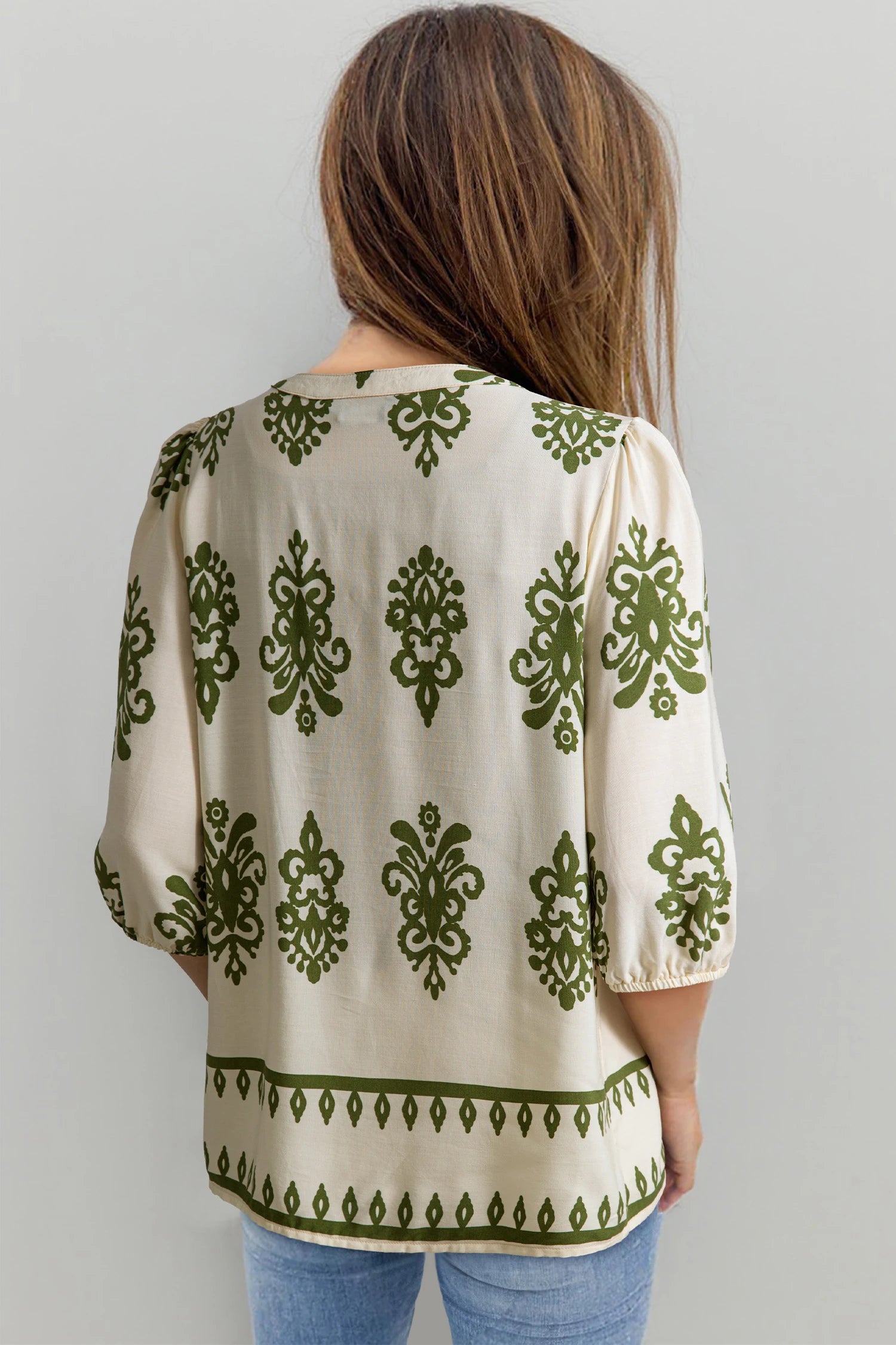 Designed with a relaxed, vintage-inspired silhouette, this top features a soft folk print in earthy olive and wheat tones, evoking vintage surf town vibes. The flattering V-neckline and button-through front offer easy wear, while gently billowed sleeves and a subtle gathered waist create a laid-back yet feminine shape. Finished with delicate tassel ties, this piece is made for wandering—whether barefoot on the beach or styled with denim vintage jeans, white pants, shorts or a flowing maxi skirt for that timeless coastal look.