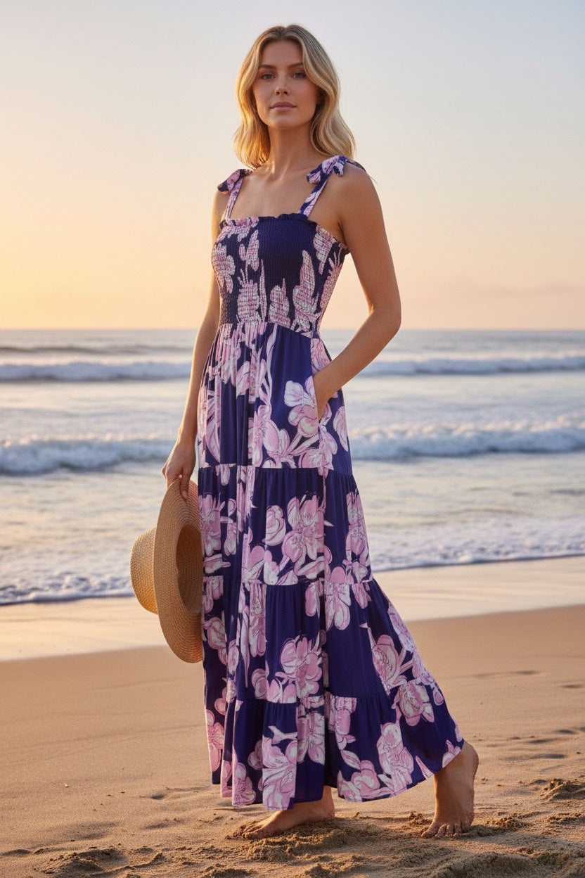 Float through summer in the dreamy Purple Haze Floral Maxi Dress, designed for effortless beauty and comfort. Featuring a flattering shirred bodice and adjustable tie straps, this dress hugs in all the right places while flowing softly into a tiered skirt for that perfect boho silhouette. The rich purple base is adorned with soft floral blooms, creating a romantic, feminine look that feels right at home on beach walks, long lunches and sunset drinks. Lightweight and breathable, it’s your go-to for warm days and endless summer nights.