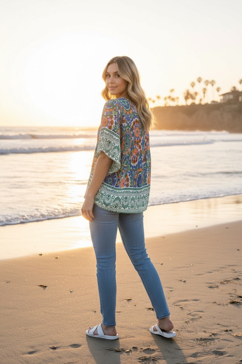 The Envy Bohemian Top is designed to be a loose fit so the sizing is generous. It's made from beautiful soft and flowy rayon and is an absolute dream to wear! We love the colour palette of green, blue, purple and orange with cute purple neckline tassels. A perfect top for all the seasons!