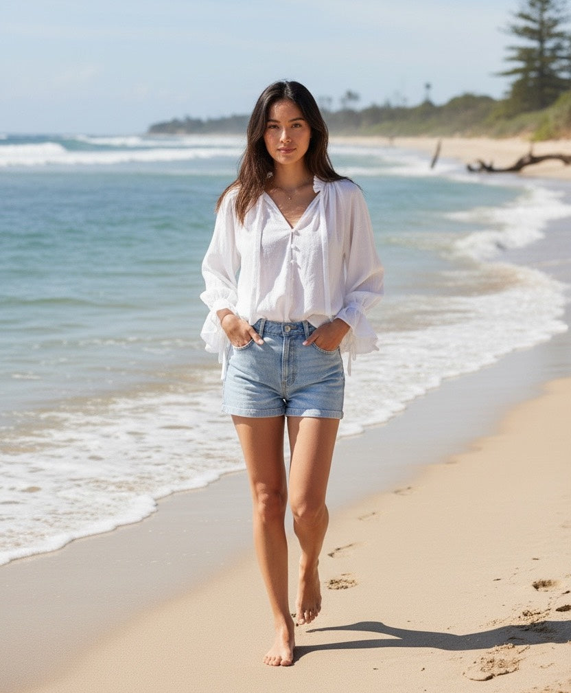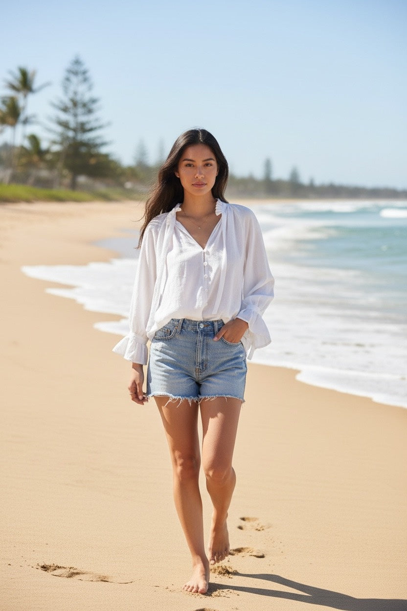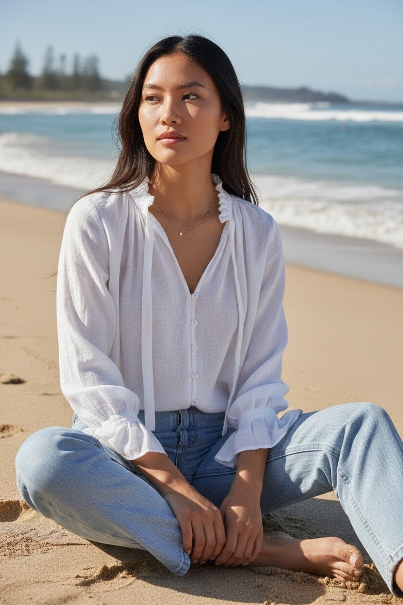 The Palos Blouse is a beautifully crafted crisp white piece that effortlessly blends romantic style with casual boho wearability. Made from soft, breathable cotton, this blouse features an oversized fit for a relaxed and effortless style that pairs perfectly with denim or tailored pieces. Delicate fabric-covered buttons run down the front, complementing the elegant frill neck detail and V-neck cut. The collar and cuffs are finished with adjustable tie details, adding a soft and feminine touch. Style it tucked in for a structured look or let it flow for an effortlessly cool aesthetic. 💙