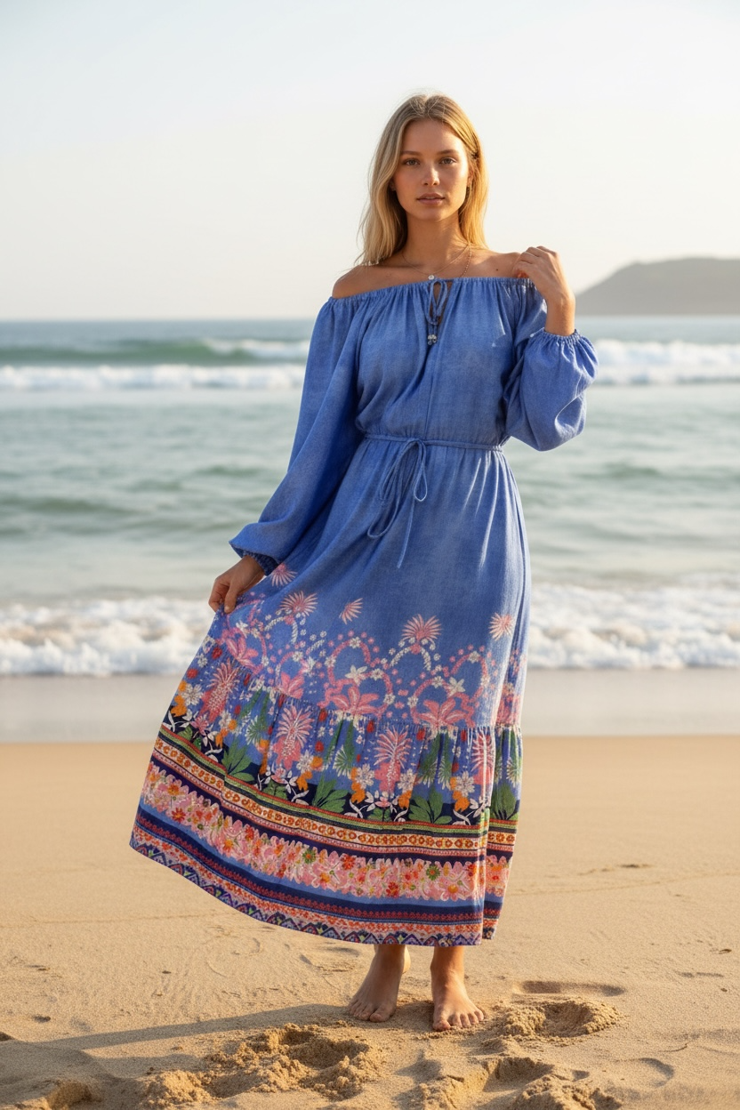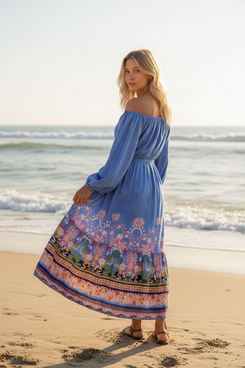 A beautiful statement dress that brings a touch of coastal magic wherever you go. The Island Garden Bohemian Maxi Dress captures the bohemian spirit perfectly. Designed with a relaxed off-shoulder adjustable neckline, billowing sleeves, and a soft tie waist, this flowing maxi drapes beautifully while offering an easy, feminine silhouette. The ocean-blue hue is adorned with vibrant island garden florals along the hem, creating a striking bohemian print that feels both romantic and free-spirited. Lightweight and breezy, it’s the perfect piece for beach walks, sunset dinners, or wandering seaside markets.