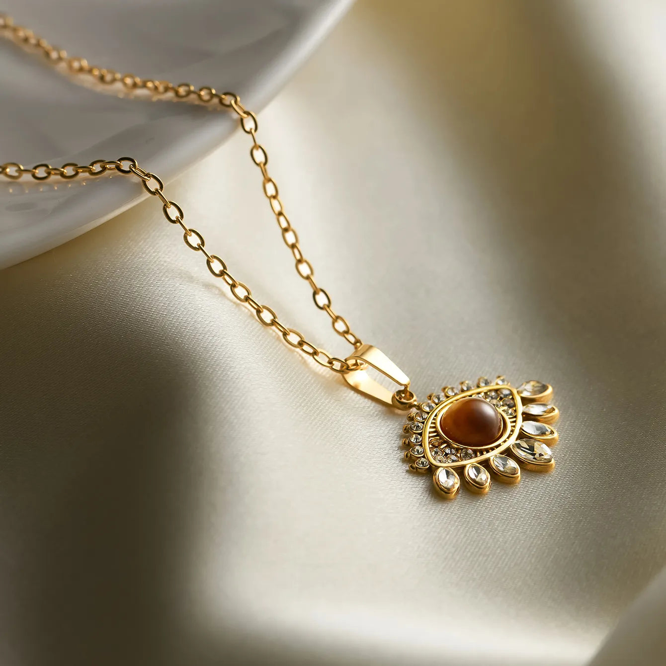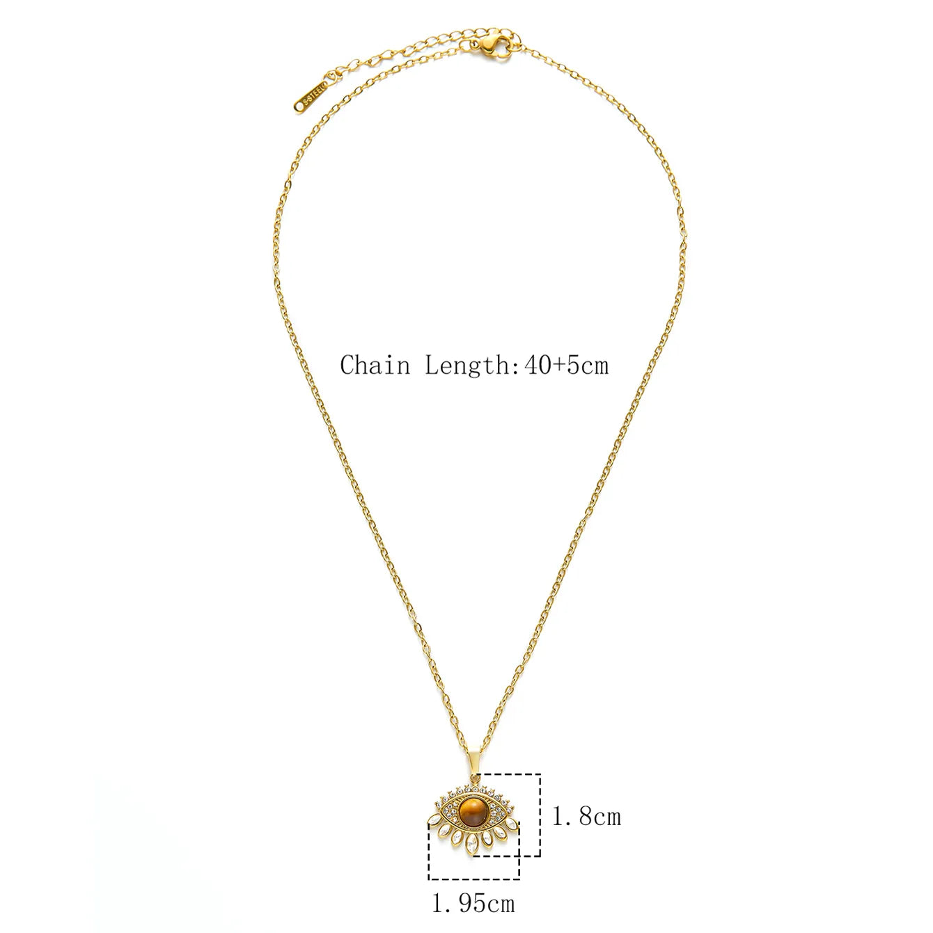 A modern talisman designed to empower. Featuring a rich tiger’s eye centre stone set within a radiant gold eye silhouette, this pendant is framed with delicate detailing that catches the light beautifully. Symbolising protection, confidence and inner strength, the Tiger's Eye Pendant Necklace is your everyday armour. The warm golden tones pair effortlessly with sun-kissed skin, floaty linens and layered chains. Bold yet refined. Protective yet feminine. A statement piece with meaning.