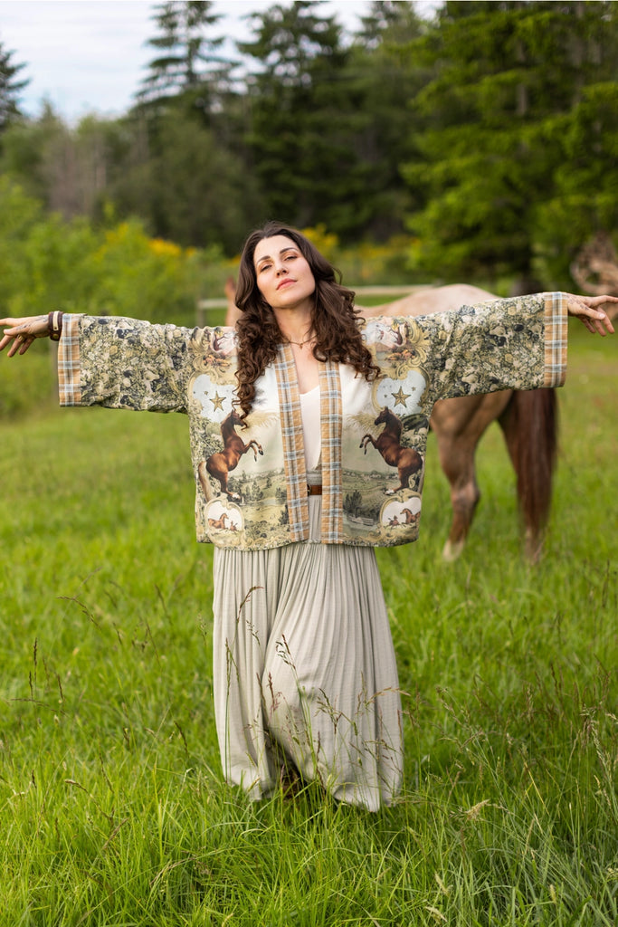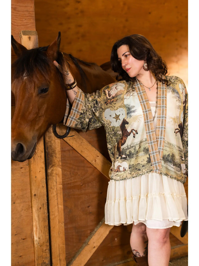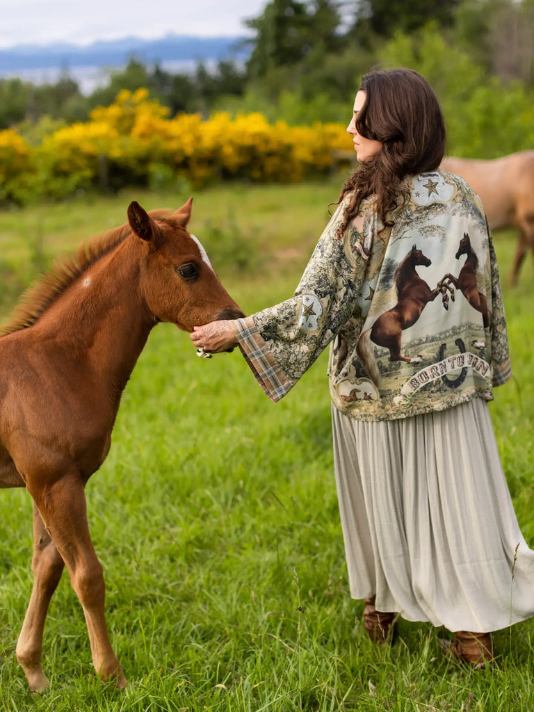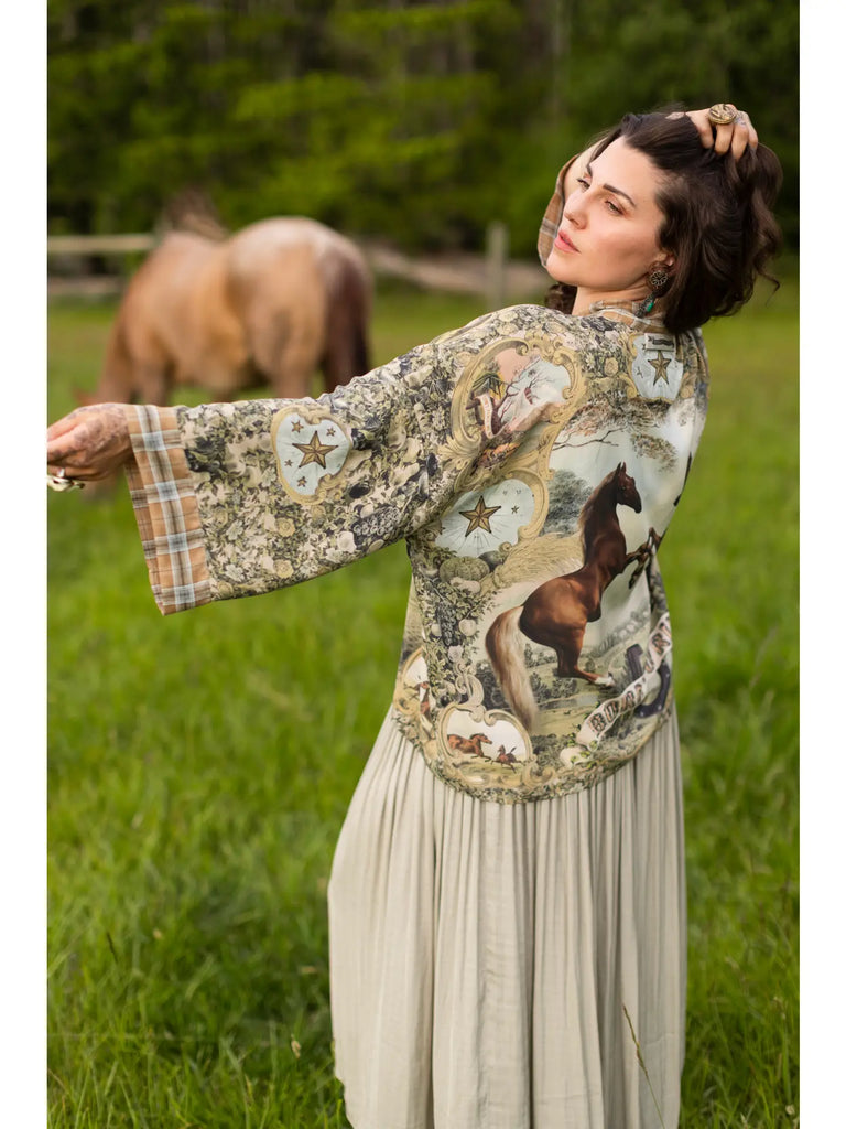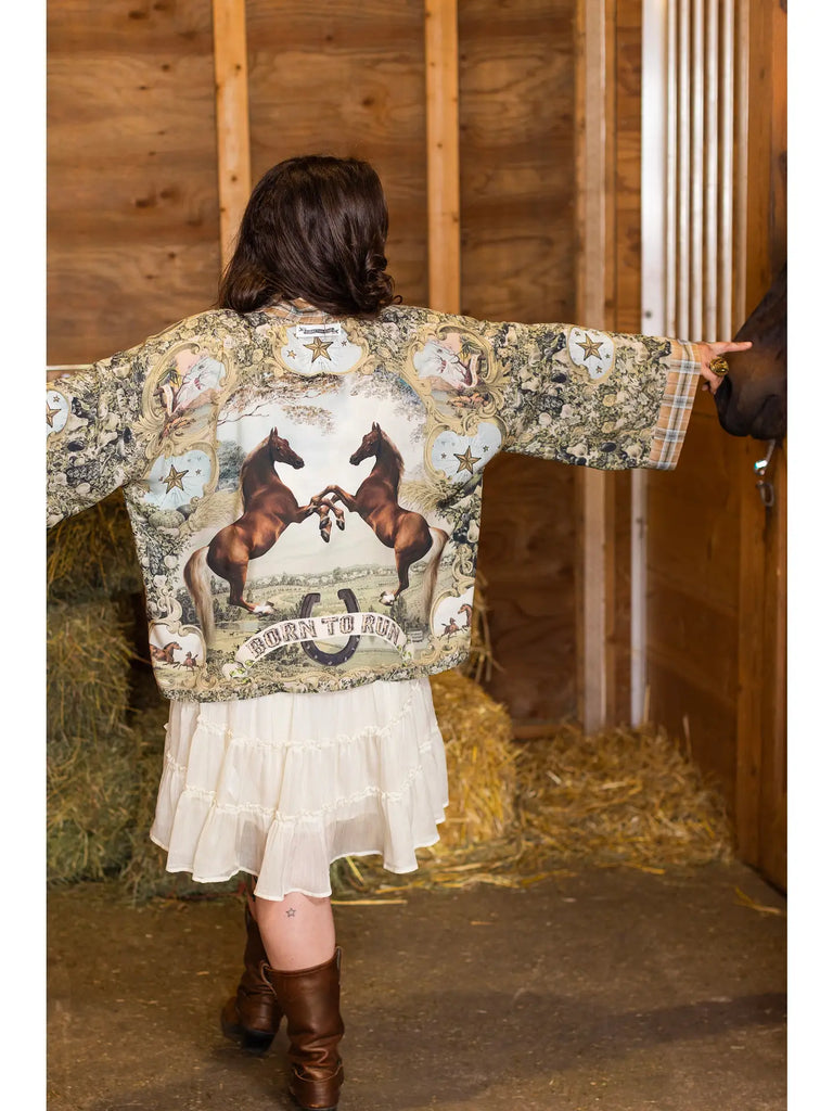 Created to celebrate the unbridled spirit of adventure, Born to Run blends vintage-washed, heritage prints with the untamed energy of two rearing racehorses by British painter George Stubbs. The antique banners, etched with mottos of rebellion like “Don’t Fence Me In”, are our spirited nod to the wild west and the open road. The beautiful, airy backdrop behind the horses is actually a scenic lithograph from the 1897 World’s Fair, and the faded florals and golden wheat were taken from an 1800’s farmers diploma. The pen-and-ink stars and upturned horseshoe are also antique drawings from the same era. And as a final, playful touch, we added a prancing mother horse and foal — a symbol of unbound freedom and joy. The whole design is trimmed in a washed heritage plaid, reminiscent of sun-faded chambray and days at home on the ranch :)