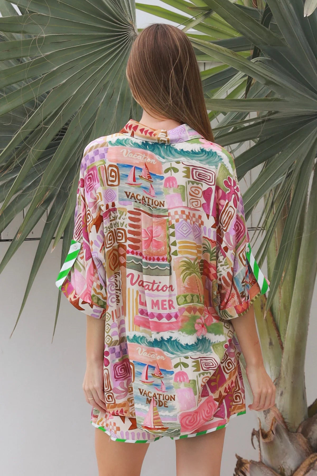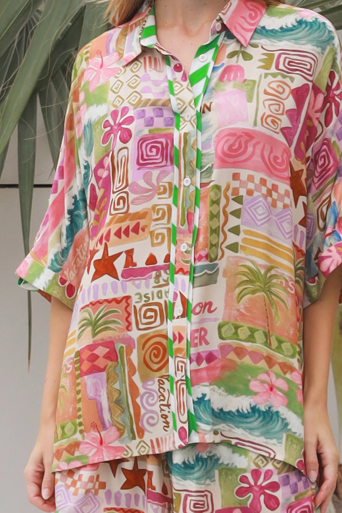 A vibrant retro two-piece made for sun-chasing days. Featuring a relaxed button-up shirt and easy elastic-waist shorts with pockets in a gorgeous kaleidoscope print, creating a nostalgic yet modern bohemian feel. Lightweight, breezy and endlessly wearable — style together or mix and match for effortless coastal cool. Can be worn over swimmers, half tucked with slides or dressed up with sandals and gold jewellery - this is your new go-to set!