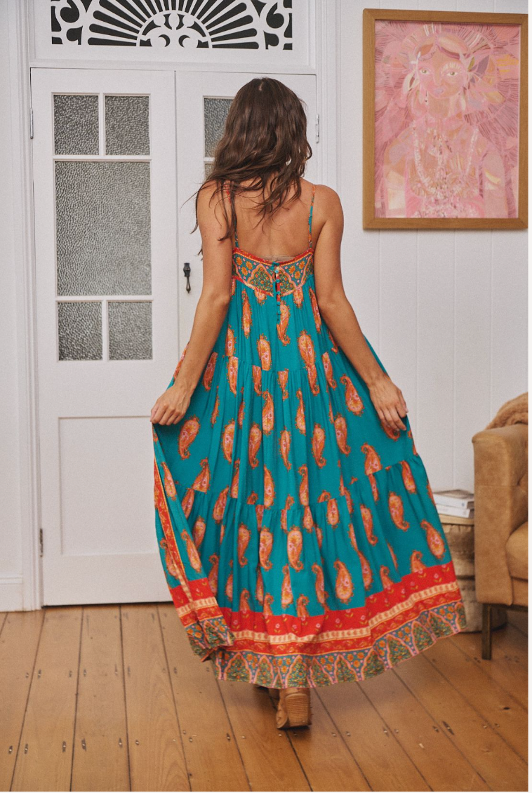 This bohemian maxi dress features a striking turquoise base adorned with intricate paisley motifs and vibrant border detailing, creating an effortlessly luxe vintage-inspired design that turns every moment into a wanderlust dream. Designed with delicate straps and a relaxed, flowing shape, it drapes beautifully with every step — perfect for sun-drenched days, market mornings, and balmy sunset dinners. So comfortable, the lightweight fabric moves freely, giving you that carefree, gypsy-spirit feel. Pair with boots for a western boho festival edge or sandals for an easy coastal vibe — this is the dress you’ll reach for all season long!