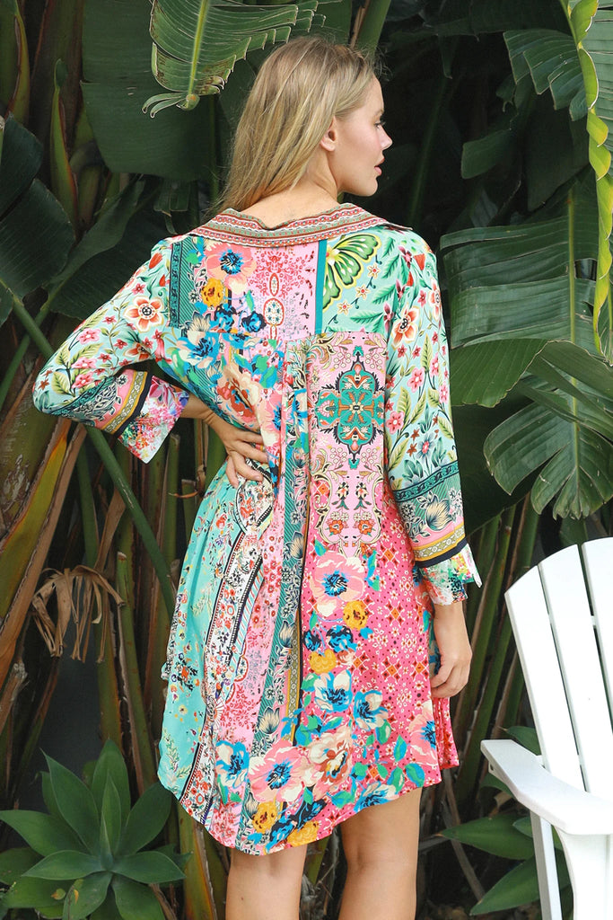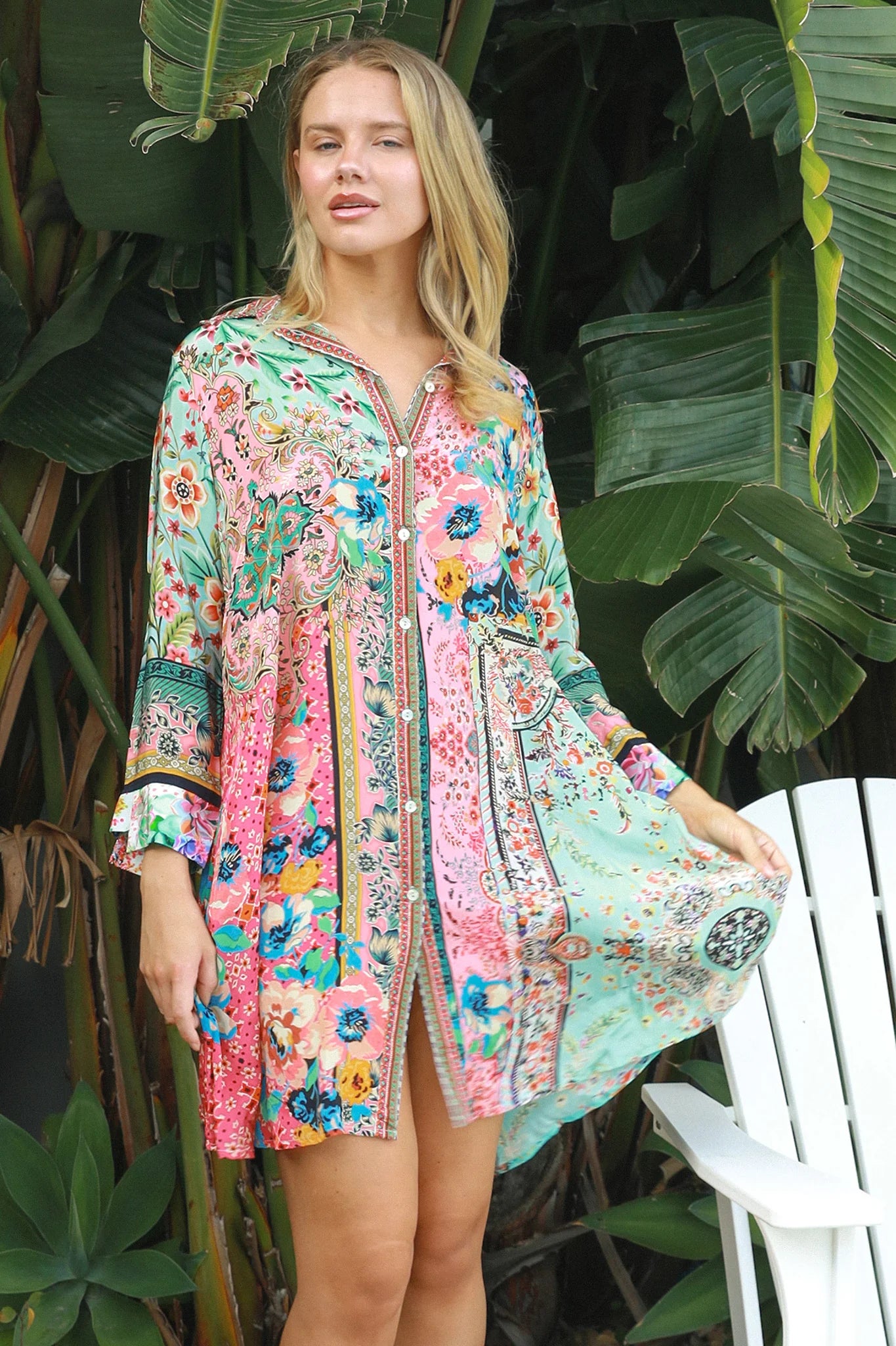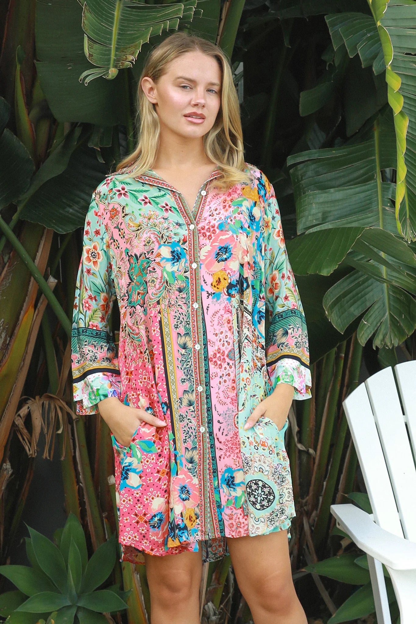 Meet the new Mosaic Resort Shirt Dress — Relaxed Luxury Meets Vibrant Boho Spirit! Immerse yourself in colour, comfort and carefree elegance with the Mosaic Resort Shirt Dress. Designed in a beautiful patchwork mosaic of tropical florals, artistic borders and soft tonal contrasts, this dress brings that calming holiday energy to every day. Lightweight and easy to wear, it features a relaxed shirt-style silhouette, full button-through front, and contrast cuffs that elevate the look. Side pockets add practicality, while the gentle drape ensures it flatters every shape with breezy comfort. Perfect for resort escapes, brunch dates, coastal strolls or simply brightening your everyday wardrobe, this dress is your go-to for feel-good style with a bohemian twist.