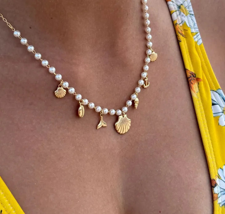 This delicate gold charm necklace features tiny shells and ocean keepsakes that shimmer with every movement. Layer it with your favourites or let it shine solo for an effortless coastal-boho vibe.
