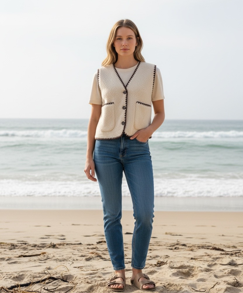 Layer up in style with the Village Knit in Vanilla, a chic essential that brings modern bohemian edge to your wardrobe. Featuring a rich boucle knit with chocolate blanket-stitch crochet edging, this vest is all about texture and timeless contrast. The flattering v-neckline and three button front make it perfect for effortless layering over your favourite tops or dresses. This vest is as practical as it is stylish - ideal for coffee catch-ups, weekend markets or adding some style to a neutral outfit. Pair with some wide-leg denim for an elevated vintage vibe! 🤎